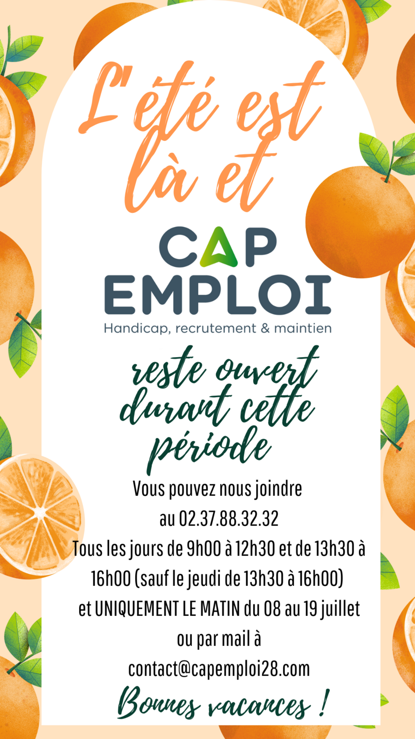 CAP EMPLOI reste ouvert tout l'été ! Durant cette période, vous pouvez nous joindre au **02 37 88 32 32 ** Tous les jours de 9h00 à 12h30 et de 13h30 à 16h00 (sauf le jeudi de 13h30 à 16h00) et UNIQUEMENT LE MATIN du 08 au 19 juillet.